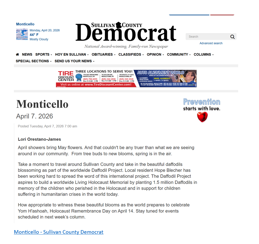 Beginning on September 11, 2022 at Congregation Agudas Achim in Livingston Manor, NY and continuing through to Monticello, Liberty and Parksville, NY, the Daffodil Project brings people together.